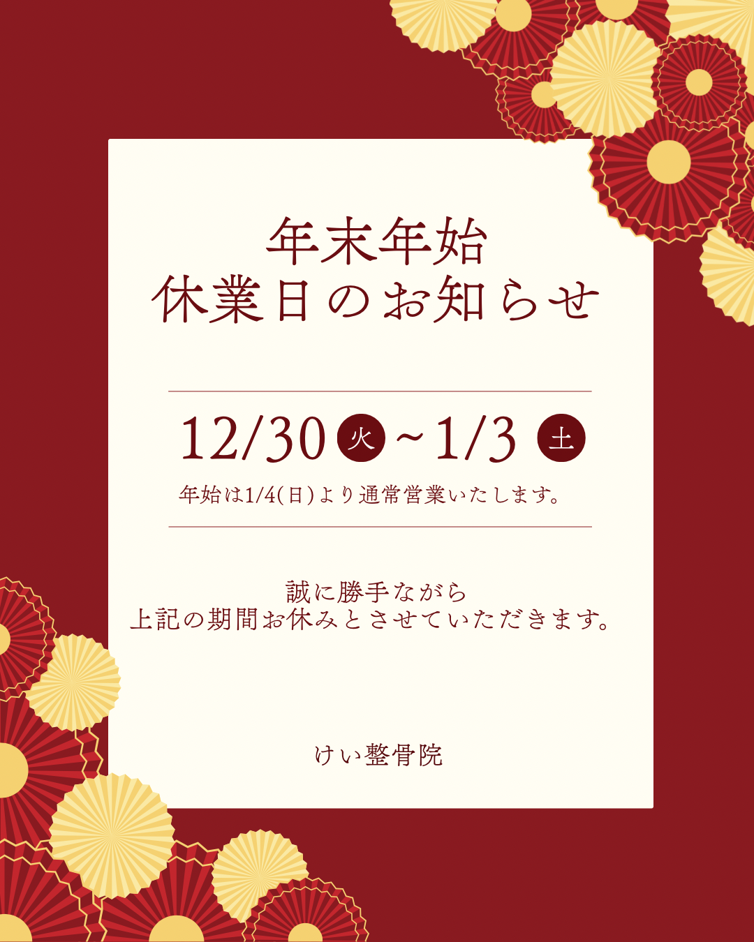 函館市昭和 けい整骨院 年末年始 休業日のお知らせ🎍 12/30(火)〜1/3(土)休院となります🎌 年始は1/4(日)から通常営業いたします。 当院では交通事故患者様を随時受付中です。 事故に遭われた場合は当院にご相談ください🚗